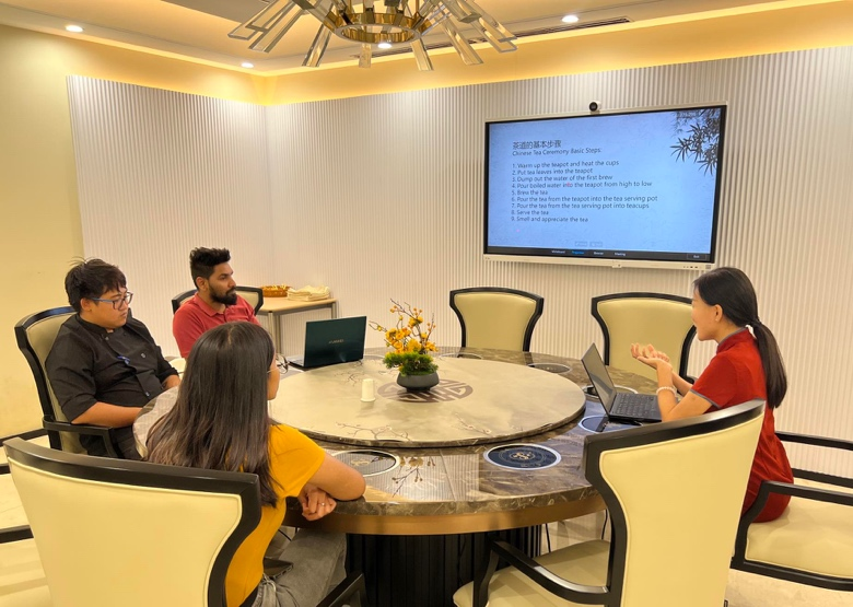 应毛里求斯华为公司邀请,毛里求斯大学孔子学院于2023年9月5日在华为公司开展了中国茶艺实操培训。此次培训旨在丰富华为员工茶文化知识、提升员工茶艺技能,以更好地满足员工对中国传统文化了解的需求。此次培训由毛里求斯大学孔子学院志愿者教师喻鹏程主讲,来自华为行政部门的四名员工参加了培训课程。