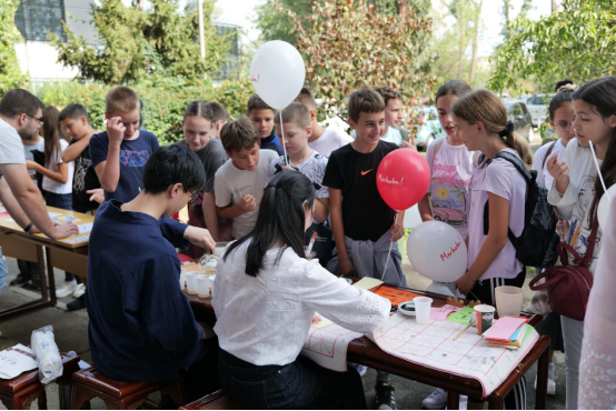 当地时间9月26日,孔子学院师生应邀参加诺维萨德大学哲学院主办的2023年“欧洲语言日”活动。活动现场,“汉语展区”受到了热烈欢迎。孔院师生通过用毛笔书写中文名、茶艺体验等方式展现了中华文化的独特魅力,让他们感受中国茶的温度,品味中国茶的韵味。互动交流中,进一步激发了他们对学习中文的日常用语和茶文化相关知识的兴趣。