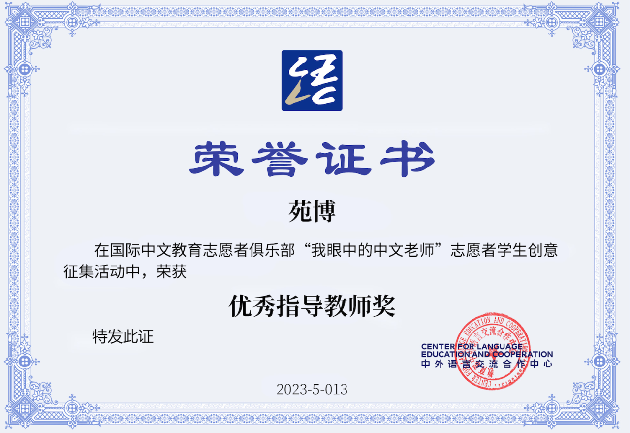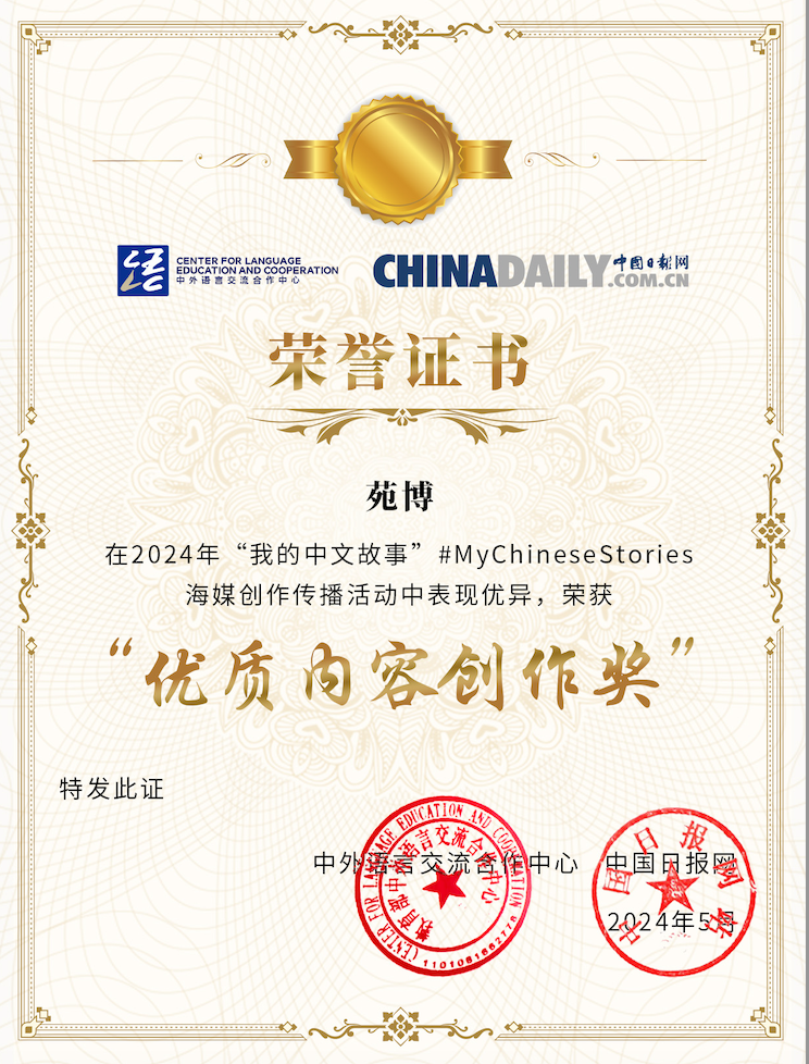 2024年5月,中外语言交流合作中心与中国日报网联合发起了“国际中文日”系列线上活动。玛丽秀社区大学孔子学院的苑博老师获得第十名的好成绩,荣获“优质内容创作奖”。
