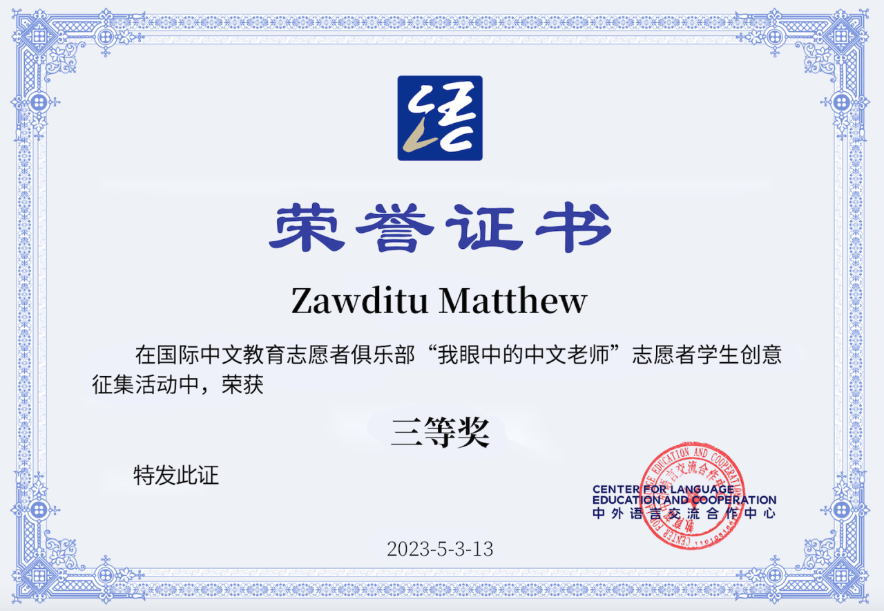 5月18日,由教育部中外语言交流合作中心国际中文志愿者俱乐部举办的“我眼中的中文老师”志愿者学生创意征集活动落下帷幕。玛丽秀社区大学孔子学院学生Zawditu Mattew荣获“三等奖”,苑博老师荣获“优秀指导教师奖”。