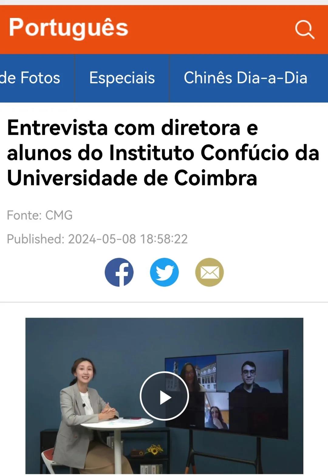5月8日,科英布拉孔子学院两名学生高安安(Andreia)、古黎明(Guilherme)作为代表,同周淼院长一同接受了CGTN(中国环球电视网)的采访。