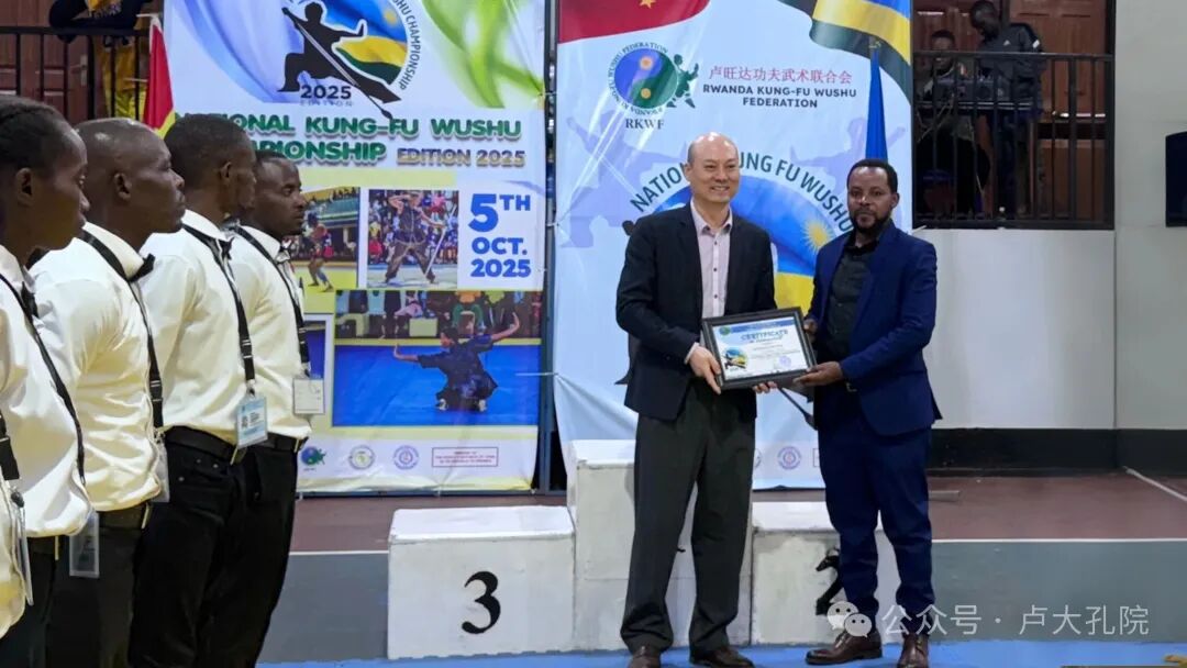 10月5日,2025年卢旺达全国武术锦标赛在基加利中学落下帷幕。中国驻卢旺达大使馆代表、卢旺达体育部代表、卢旺达大学孔子学院中方院长曾广煜及卢旺达功夫武术协会主席瓦伦斯共同出席闭幕式,为获奖选手颁奖,见证这场汇聚全国27个功夫俱乐部、近百名选手的武术盛会圆满收官。