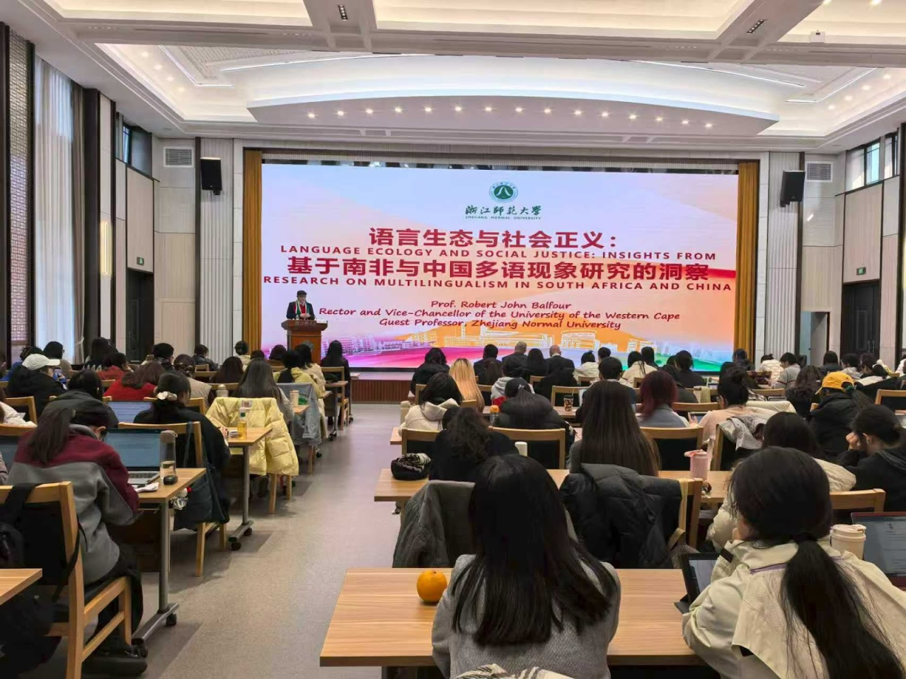 近日,西开普大学校长罗伯特·约翰·贝尔福教授率代表团访华,先后到访北京外国语大学、浙江中医药大学、浙江师范大学及金华市政府。访问期间,贝尔福校长在北京外国语大学和浙江师范大学,围绕“语言生态与社会正义:基于南非与中国多语现象研究的洞察”主题举办了两场专业讲座,吸引了两校众多硕士、博士研究生参与交流。