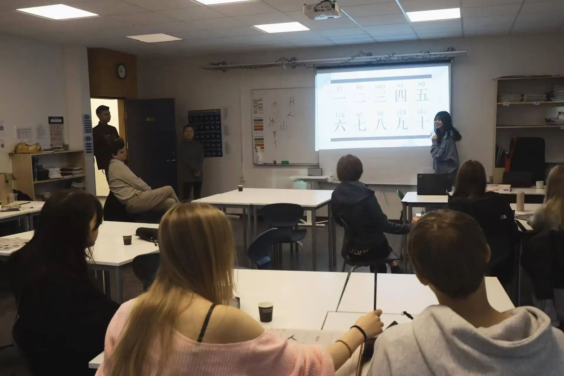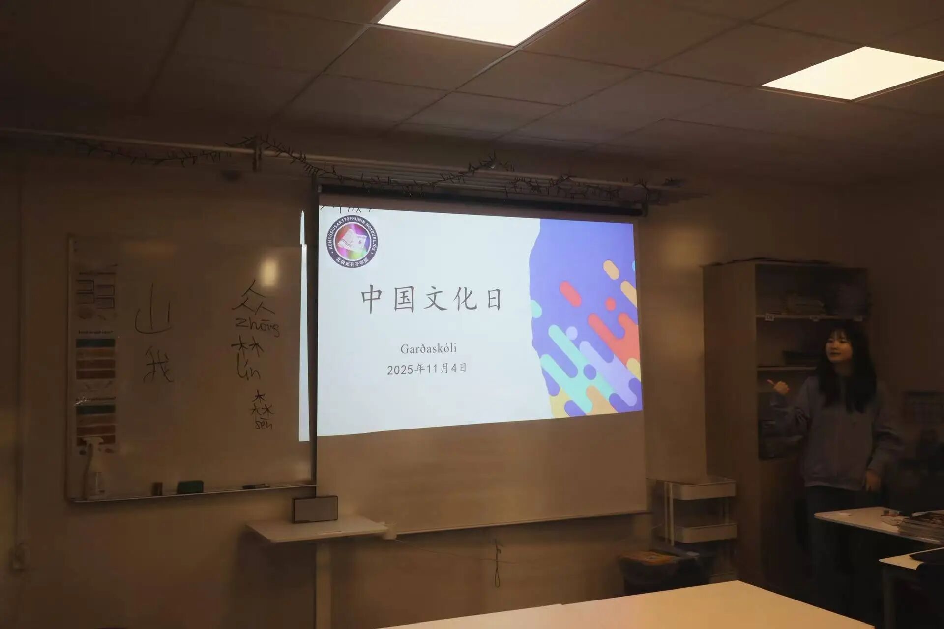 11月5日,冰岛大学北极光孔子学院与雷克雅未克规模最大的初中加扎斯科里中学合作,在该校举办“中国日”主题活动。孔院现场开设“中文小课堂”,讲授汉字知识与基础中文表达,并设置文化展区,组织书法、茶艺、踢毽子等文化体验与展示活动。冰方院长马克、中方院长徐赛颖、孔院教师及该校师生共30余人参加。