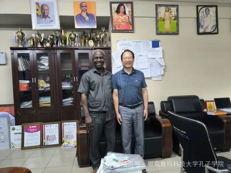 12月18日,恩克鲁玛科技大学孔子学院中方院长柯宁立与公派教师高子娟前往KNUST附属高中,拜访该校校长Duodu先生,就中文教学开展情况进行了深入交流。