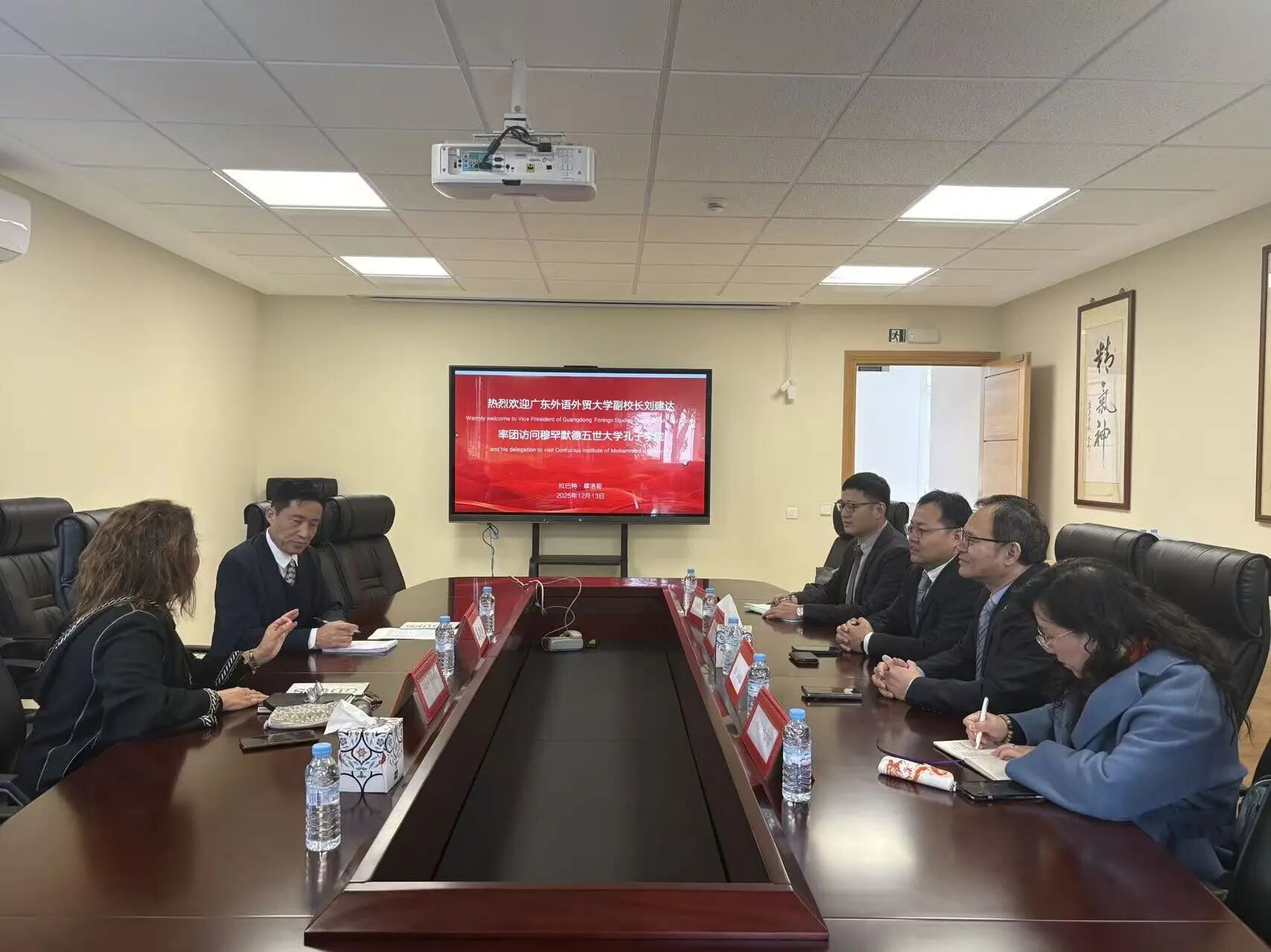当地时间12月13日,广东外语外贸大学副校长刘建达率团访问摩洛哥拉巴特穆罕默德五世大学孔子学院,代表团参观了孔院教学与文化设施,观摩课堂教学,并与孔院中方院长戴晓琦、外方院长卡丽玛·叶特利比等就办学理念、孔院管理、校际合作等议题进行了交流。