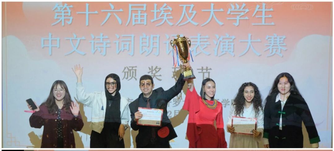 12月4日,第十六届埃及大学生中文诗词朗诵表演大赛在开罗大学孔子学院成功举办,由开罗大学孔子学院与中文系联合主办。来自埃及17所高校及孔子学院的24组选手参与,通过诗词朗诵与知识问答相结合的形式,演绎了经典及原创诗作,内容涵盖友谊、家国情怀、文明交流等主题。最终,艾因夏姆斯大学中文系代表队以原创诗歌《光尘之问》获得一等奖。