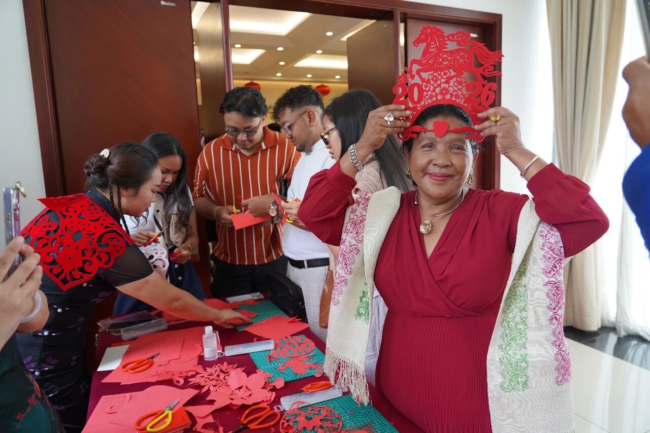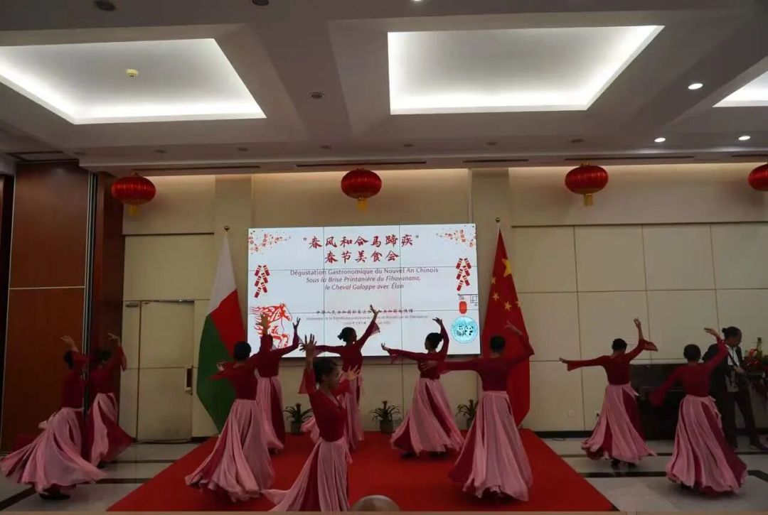 当地时间2月7日,中国驻马达加斯加大使馆举办“春风和合马蹄疾”春节美食会。塔那那利佛大学孔子学院师生应邀参与,精心准备了舞龙舞狮、写春联、剪纸等文化体验,并表演了歌曲《上春山》和舞蹈《美丽中国》。季平大使、马方政要及各界代表约150人出席。