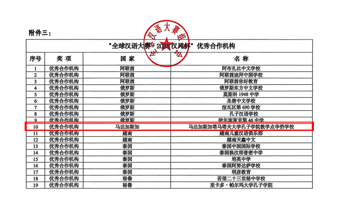 当地时间2月7日,由陕西省社会组织国际交流促进会指导、陕西省汉语国际教育研究会主办的“全球汉语大赛·2025汉风杯”评选结果正式揭晓。来自马达加斯加塔马塔夫大学孔子学院及其教学点的学生在本次全球性赛事中表现优异,共有12名学生斩获奖项。同时,孔院华侨学校教学点因出色的组织工作荣获“优秀合作机构”称号。