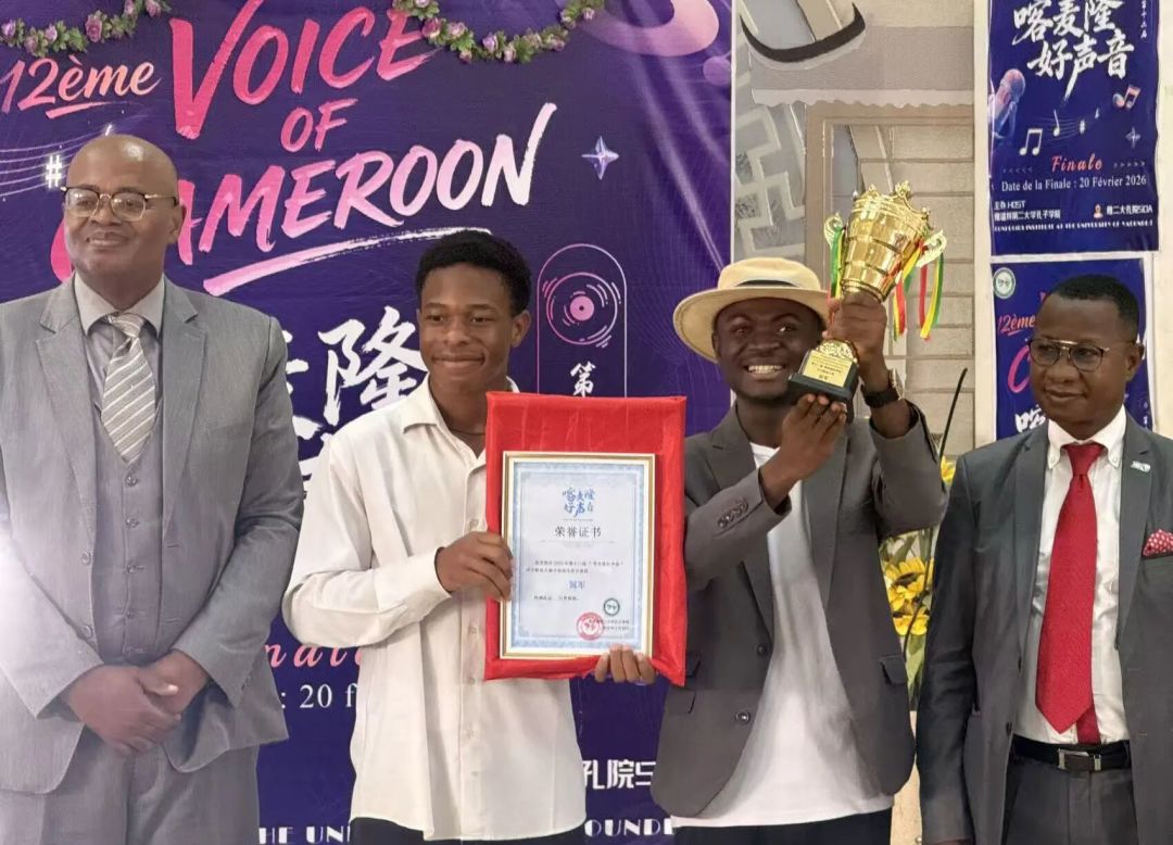 当地时间2月20日,雅温得第二大学孔子学院举办第十二届“喀麦隆好声音”中文歌曲大赛总决赛。12名选手演唱了《蒙娜丽莎的眼泪》《天路》等多首中文歌曲,最终6号组合吴用和林冲以改编版《蒙娜丽莎的眼泪》夺冠。中国驻喀麦隆大使徐永、大学副校长奥沃纳·恩奎尼·马蒂亚斯·埃里克、联合国教科文组织中非区域办事处主任姆普图·阿法苏卡·希莱尔及孔院师生250余人出席活动。